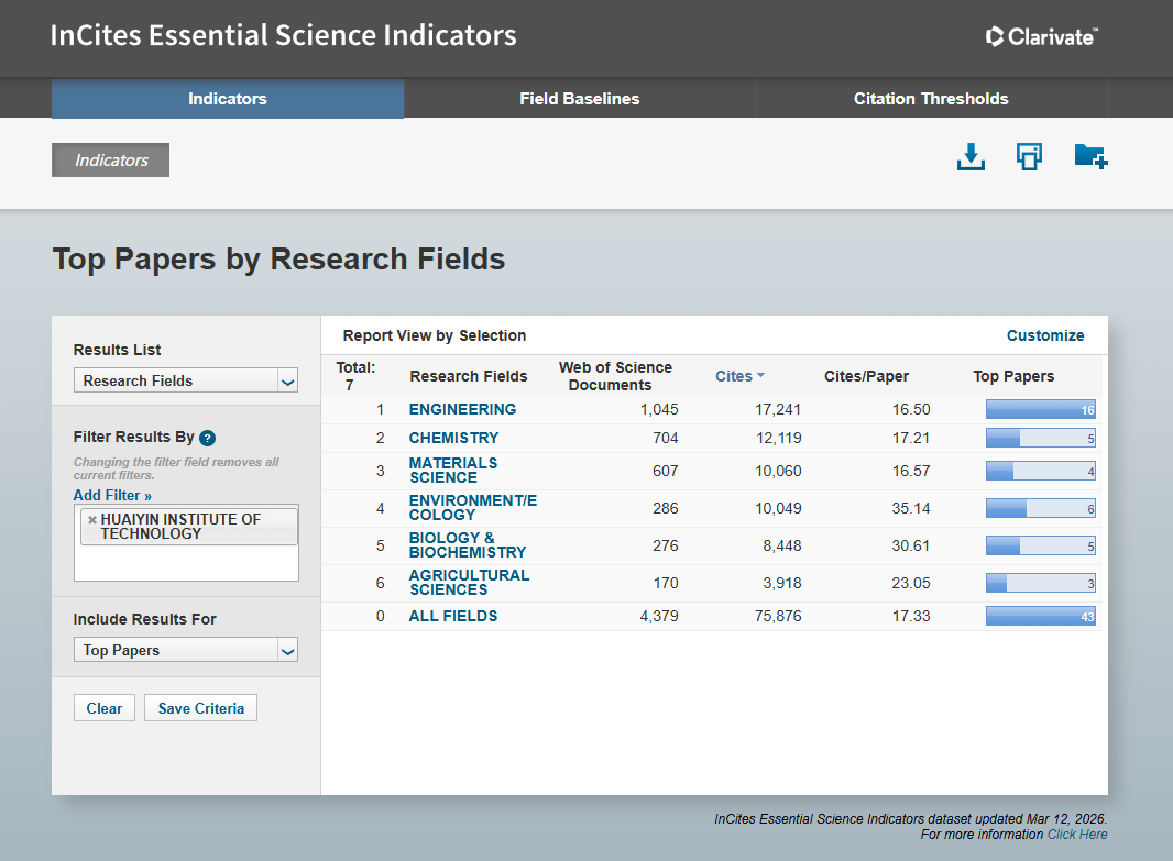 今日,科睿唯安(Clarivate)发布2026年3月ESI(Essential Science Indicators,基本科学指标)数据,淮安大学农业科学成功跻身ESI全球排名前1%。这是学校继工程学、化学、材料科学、环境与生态学、生物学与生物化学之后,新增的第6个ESI全球前1%学科,标志着学校学科建设取得新突破,科研实力与国际影响力持续攀升。