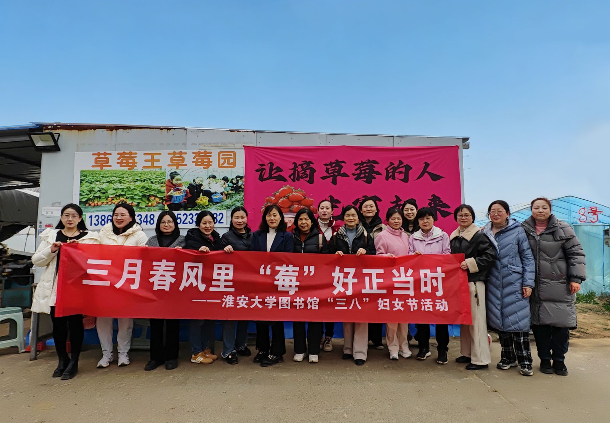 春风送暖,万物复苏。为庆祝第116个“三八”国际妇女节,丰富女职工业余文化生活,切实增强职工的归属感与幸福感,3月18日下午,图书馆分工会组织女职工前往淮阴区草莓王采摘园,开展“三月春风里・‘莓’好正当时”主题采摘活动。